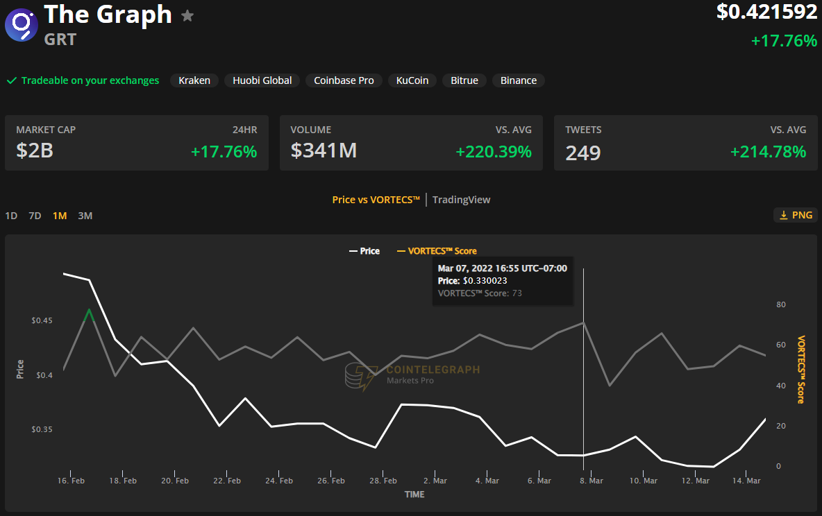 VORTECS™ data from Cointelegraph Markets Pro began to detect a bullish outlook for GRT on March 7, prior to the recent price rise.