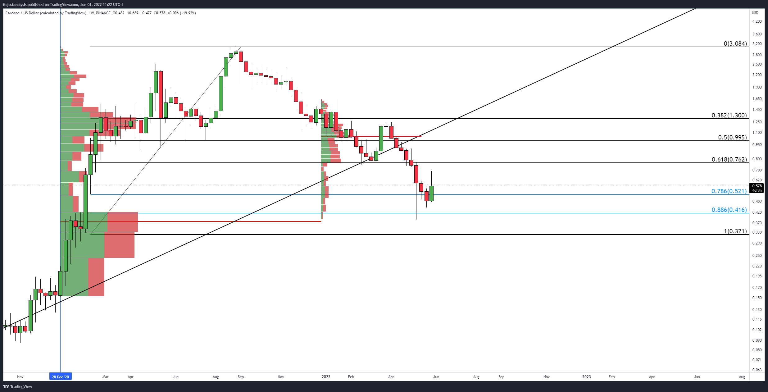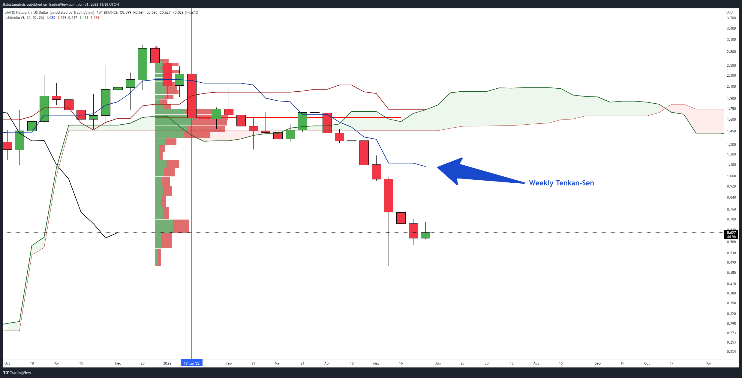 The weekly Kijun-Sen is at $1.02 and contains the 2021 volume point of control and the 50% Fibonacci retracement of the all-time high to the low of January 25, 2021.