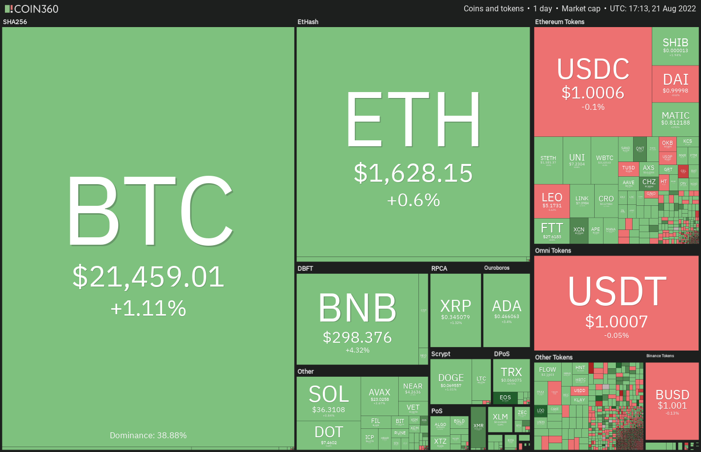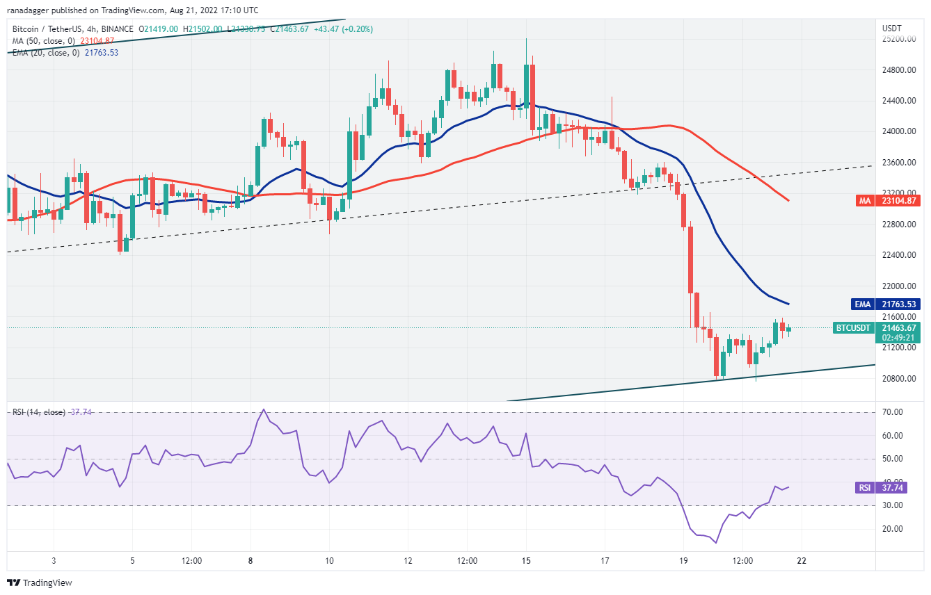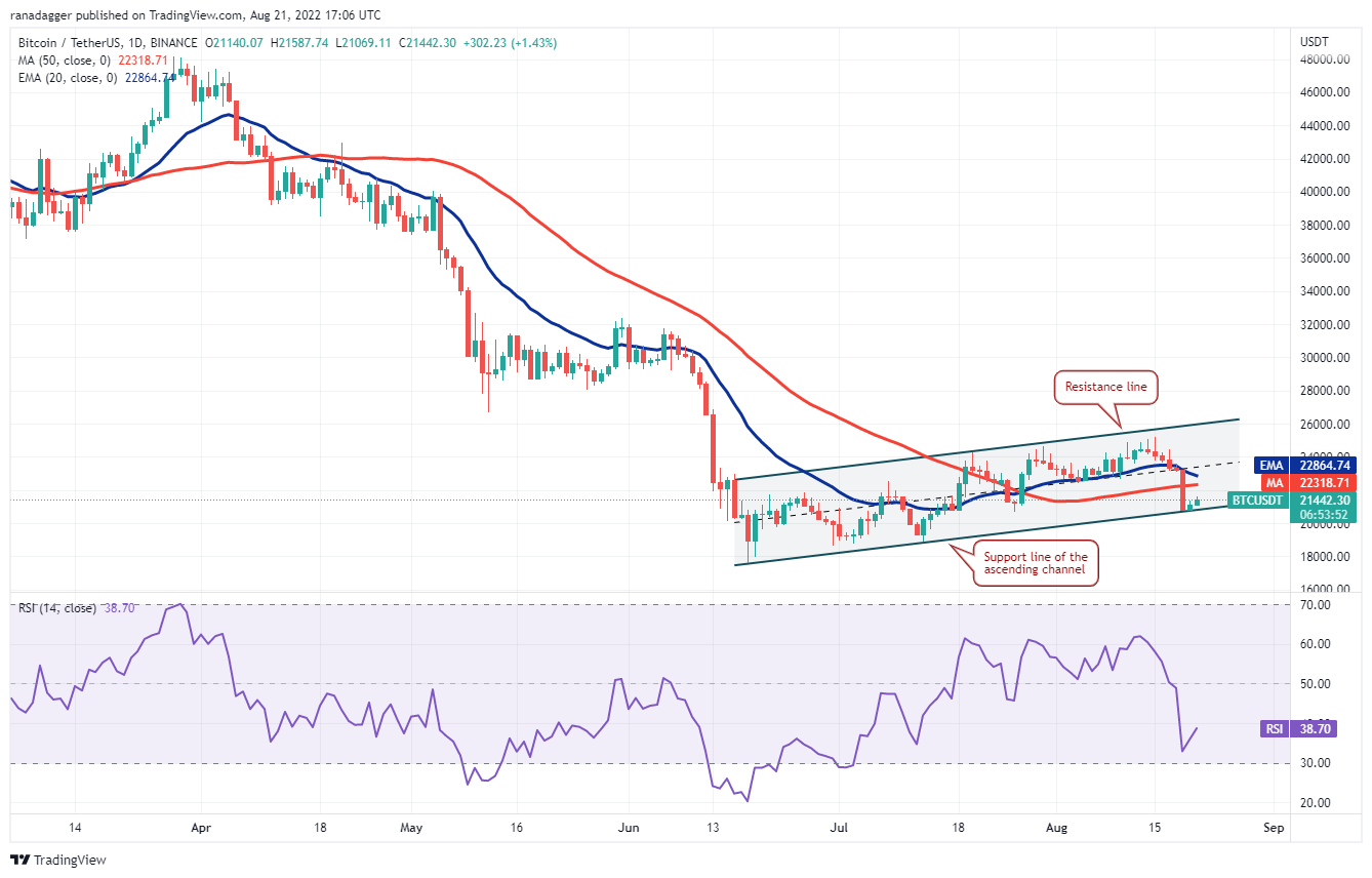 Bitcoin slipped below the 20-day exponential moving average ($22,864) on Aug. 17 and then below the 50-day simple moving average ($22,318) on Aug. 19. The bulls are attempting to arrest the decline at the support line of the ascending channel.