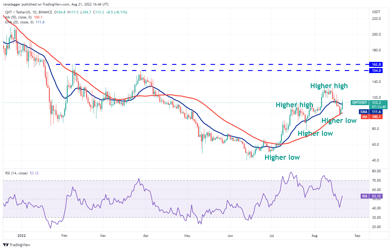 The series of higher highs and higher lows suggest that Quant (QNT) is in a short-term uptrend. The bulls purchased the drop to the 50-day SMA ($100) and are attempting to resume the up-move.