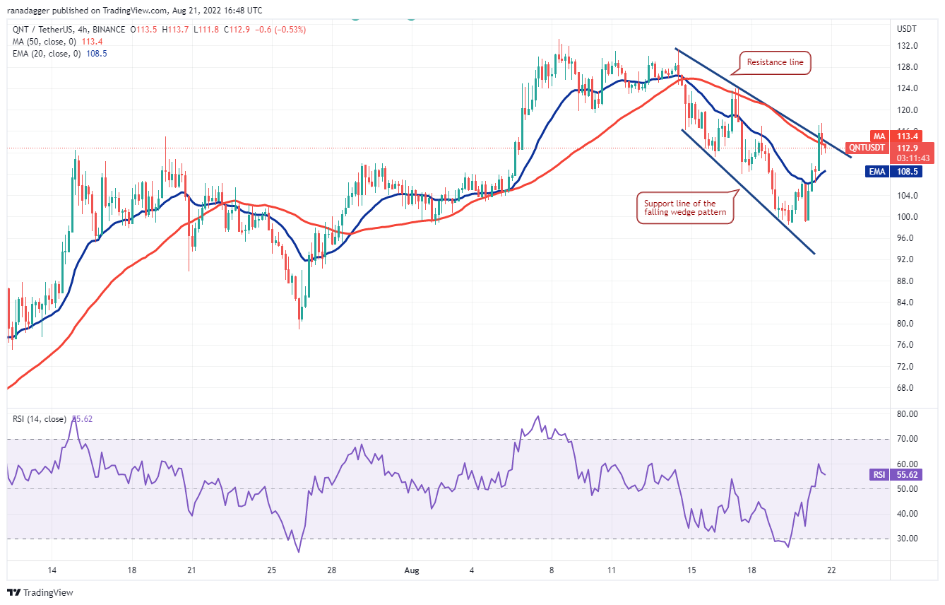 If the price sustains above the 20-day EMA ($111), it will suggest that the correction may be over. The QNT/USDT pair could first rise to $124 and then retest the important resistance at $133. If bulls clear this hurdle, the pair could rally to the overhead resistance zone between $154 and $162.