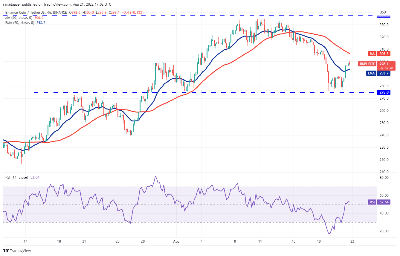 The recovery may face resistance at the 20-day EMA ($301). If the price turns down from this level, the bears will again try to sink the BNB/USDT pair below $275. If that happens, it will suggest that the pair may oscillate in a large range between $183 and $338 for some time.