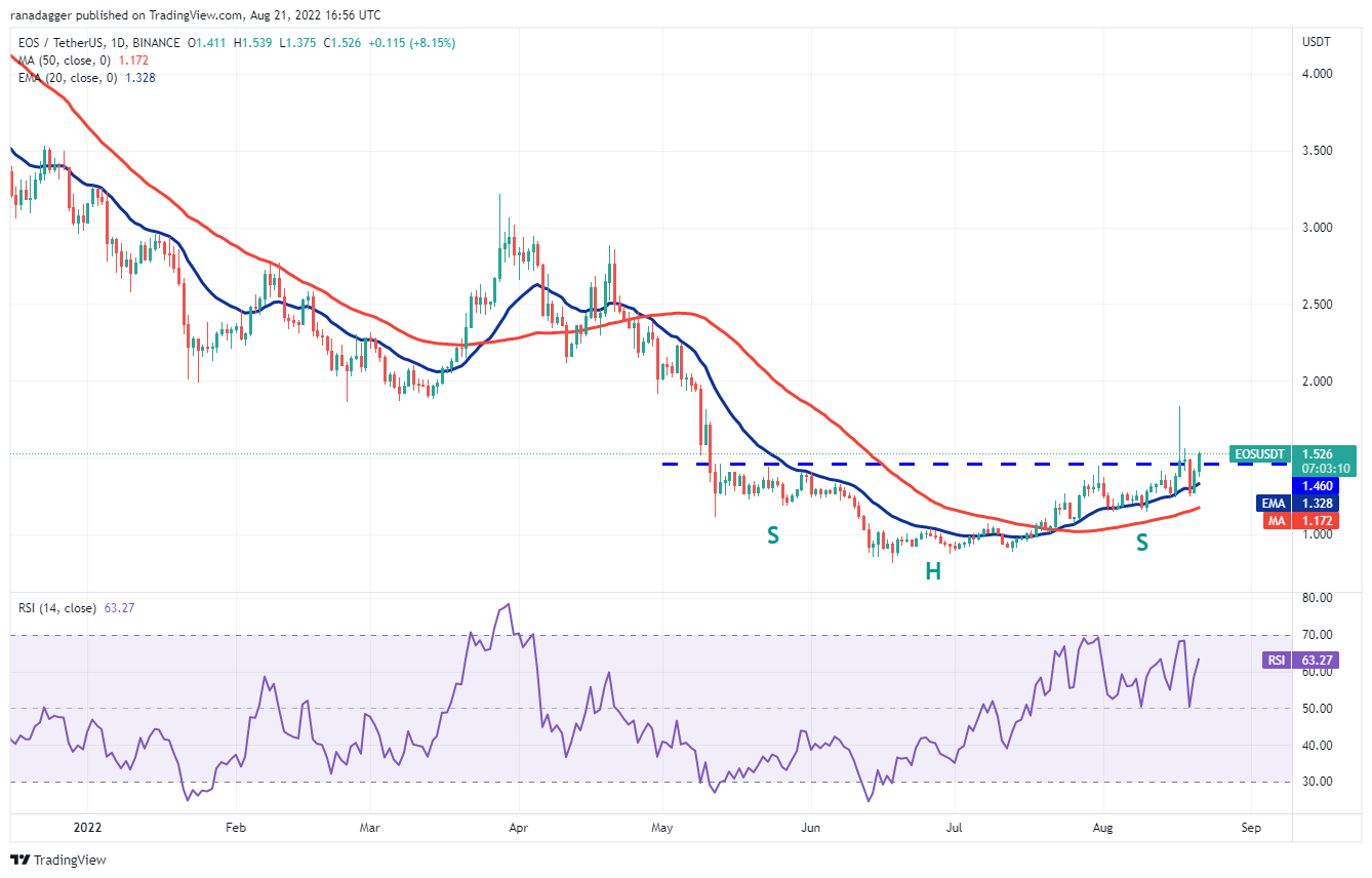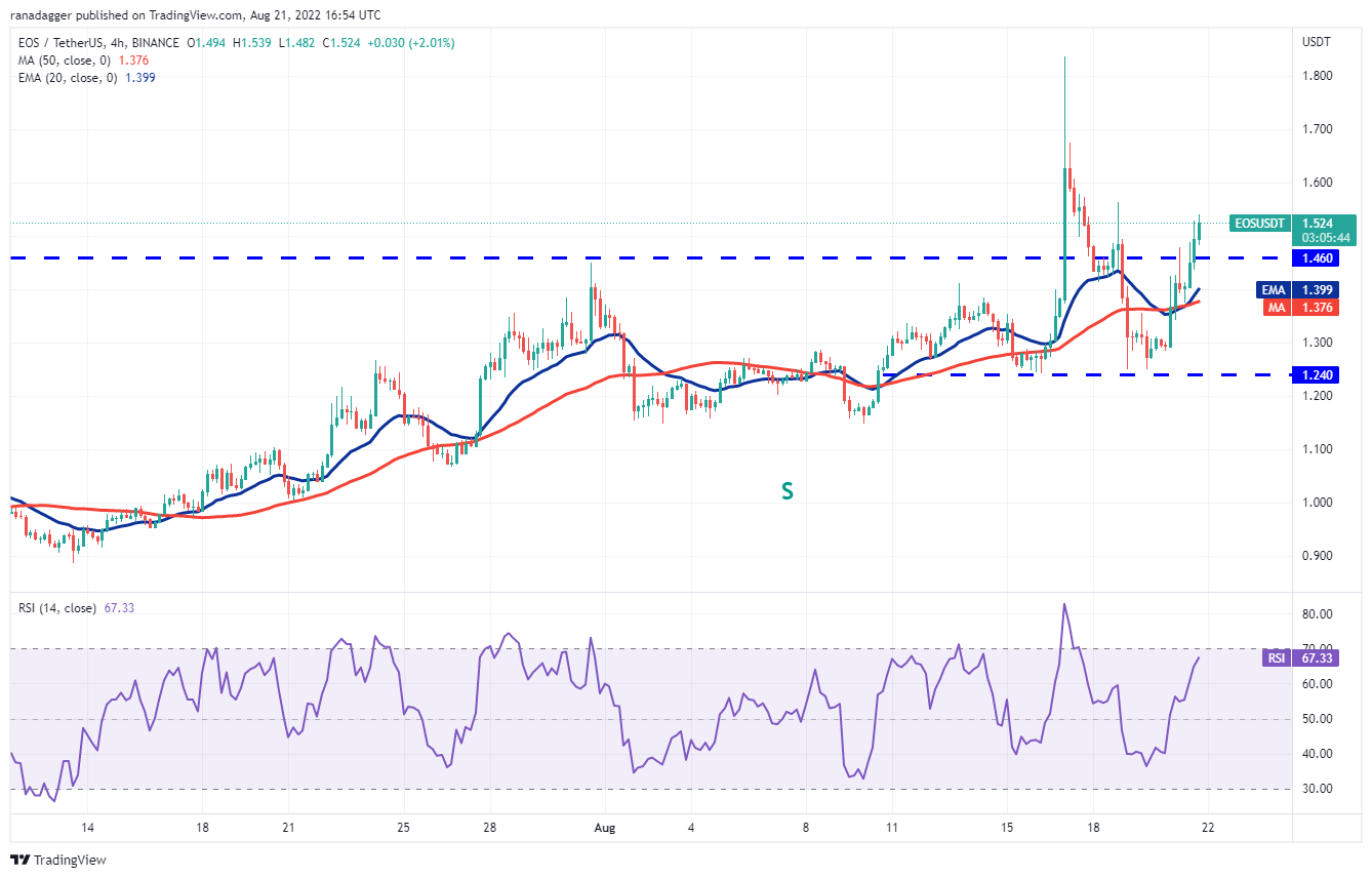 The bears pulled the price back below the breakout level of $1.46 on Aug. 19 but the positive sign is that the buyers did not allow the EOS/USDT pair to sustain below the 20-day EMA ($1.32). This indicates that lower levels are attracting buyers.