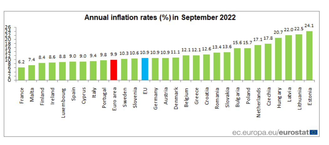 “European Union annual inflation was 10.9% in September 2022, up from 10.1% in August. A year earlier, the rate was 3.6%. These figures are published by Eurostat, the statistical office of the European Union.”
