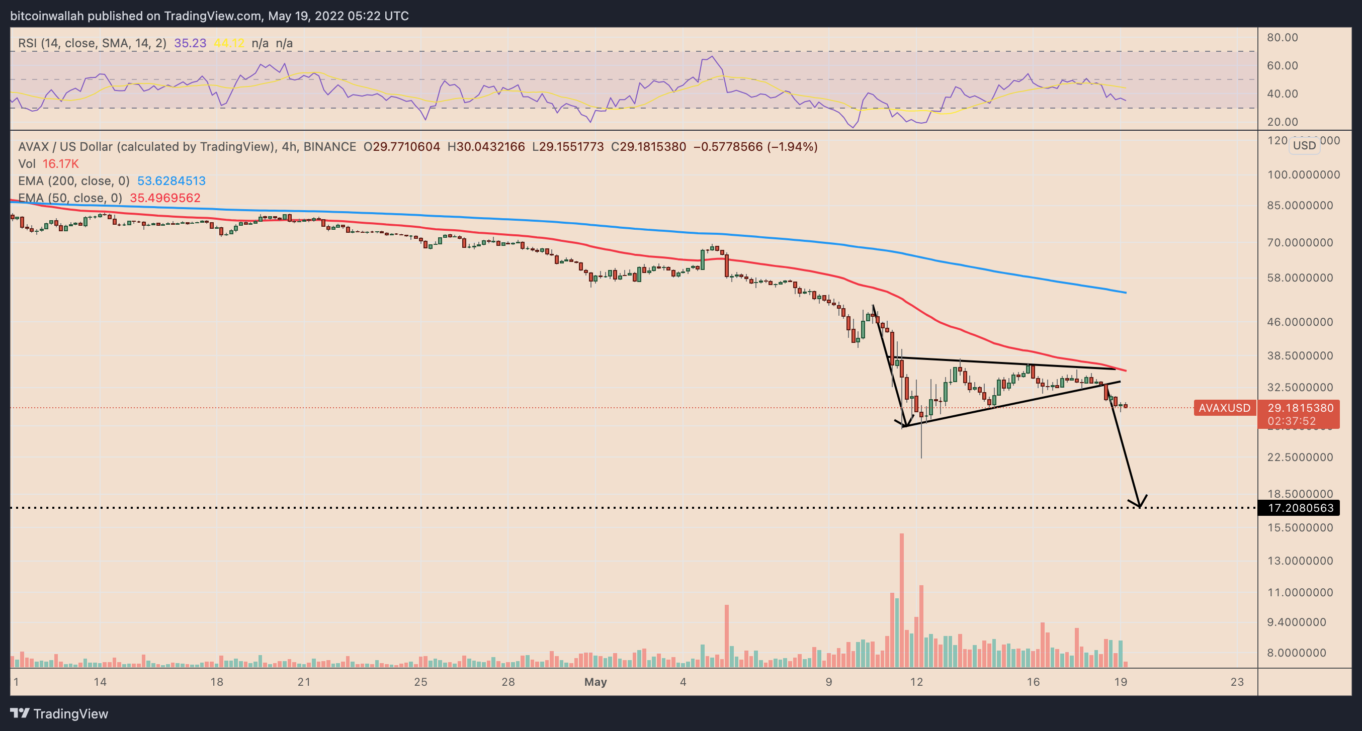 The bear pennant setup puts AVAX en route to around $17 in May, down about 40% from May 19’s price.