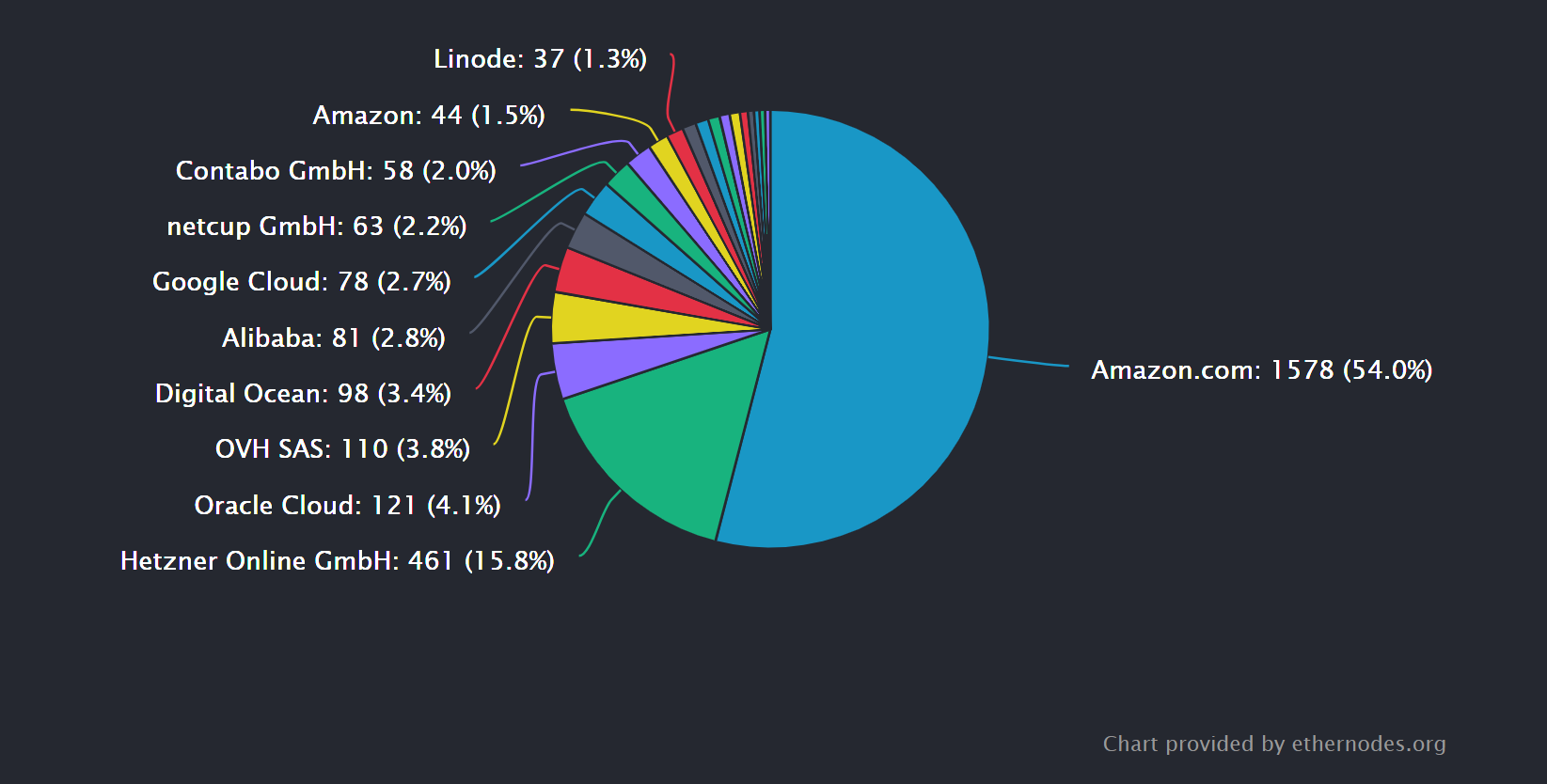 The majority of the Ethereum ecosystem currently runs on Amazon.com, which hosts 54% of the total Ethereum nodes. Some of the mainstream cloud providers that currently host Ethereum nodes include Oracle Cloud (4.1%), Alibaba (2.8%) and Google Cloud (2.7%).