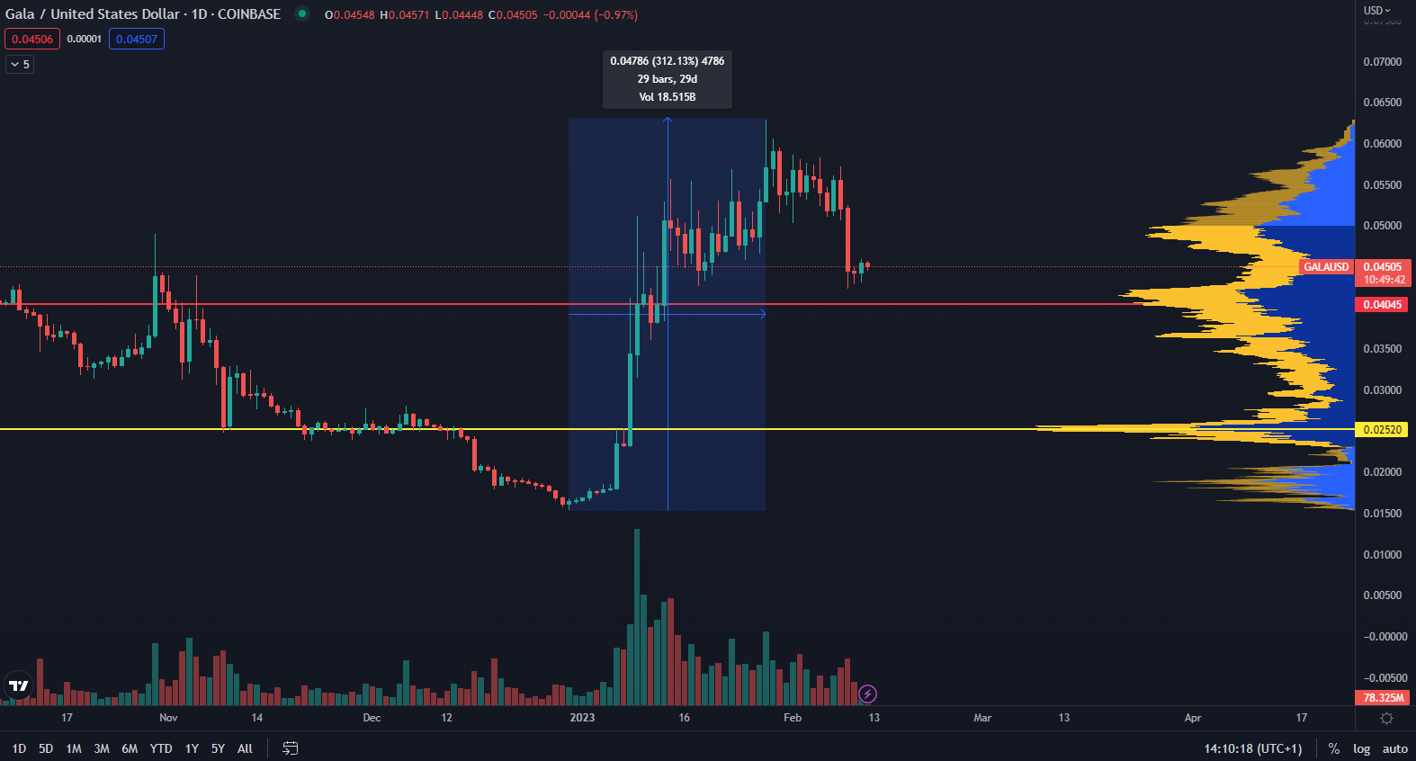 GALA sa nachádza o 95 % nižšie v porovnaní s historickým maximom dosiahnutým koncom novembra 2021. Od začiatku roka objemy vytvorili rekordný mesačný nárast, čo potvrdzuje záujem veľkých hráčov ale aj retailu. Ak táto dynamika bude pokračovať, herné kryptomeny ako GALA môžu v ďalšom bullrune vytvoriť vysoké zhodnotenie.