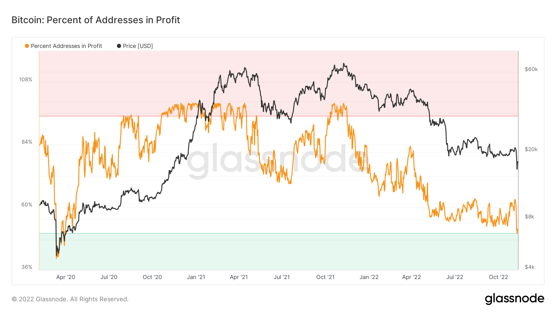 The overall number of Bitcoin addresses in profit — 50% — is meanwhile currently at its lowest since March 2020 in the aftermath of the COVID-19 crash.