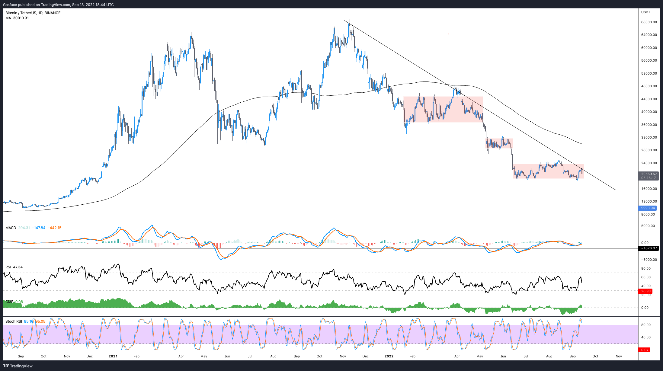 While Bitcoin’s weekend rally from Sept. 9 extended into the start of this week and the price pushed as high as $22,800, the earlier analysis cautioned that BTC was also trading near a key overhead resistance.