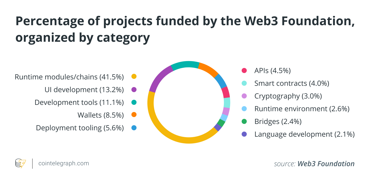 Organizations like the Web3 Foundation are providing support for the development of technologies and applications in the field of decentralized web software protocols. They provide grants to teams across the world who are helping to build out the Web3 ecosystem. The foundation currently supports 415 projects in the Polkadot ecosystem with its grant program. In addition, over 1,000 grant applications have been submitted.
