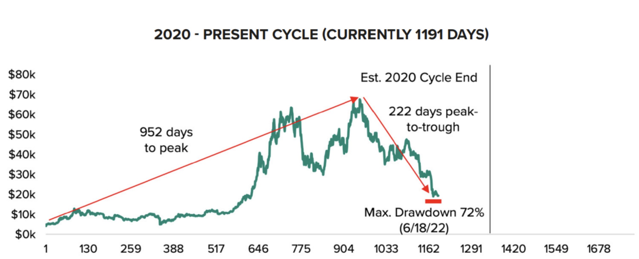 Analysts study market cycles to predict when a bear market will come to an end. Generally, market cycles include four phases: accumulation, markup, distribution and a mark-down. For Bitcoin, the market cycle occurs over four years or 1,275 days. The last phase usually relates to the bear market.