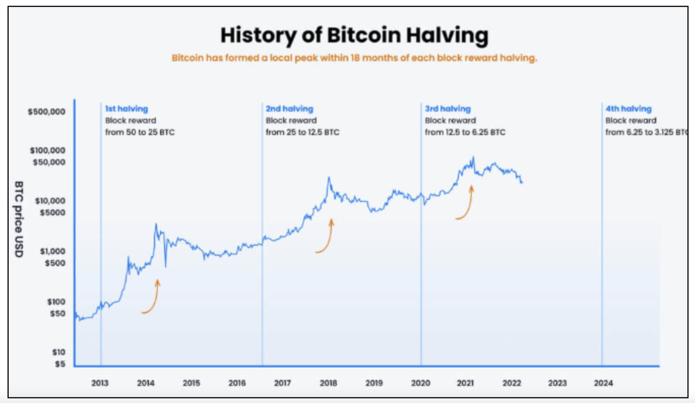 Bitcoin maximalists tend to look toward the Bitcoin halving as an indicator to predict the next bull run. Examining history, Bitcoin has formed a peak within 18 months of each Bitcoin block reward halving.