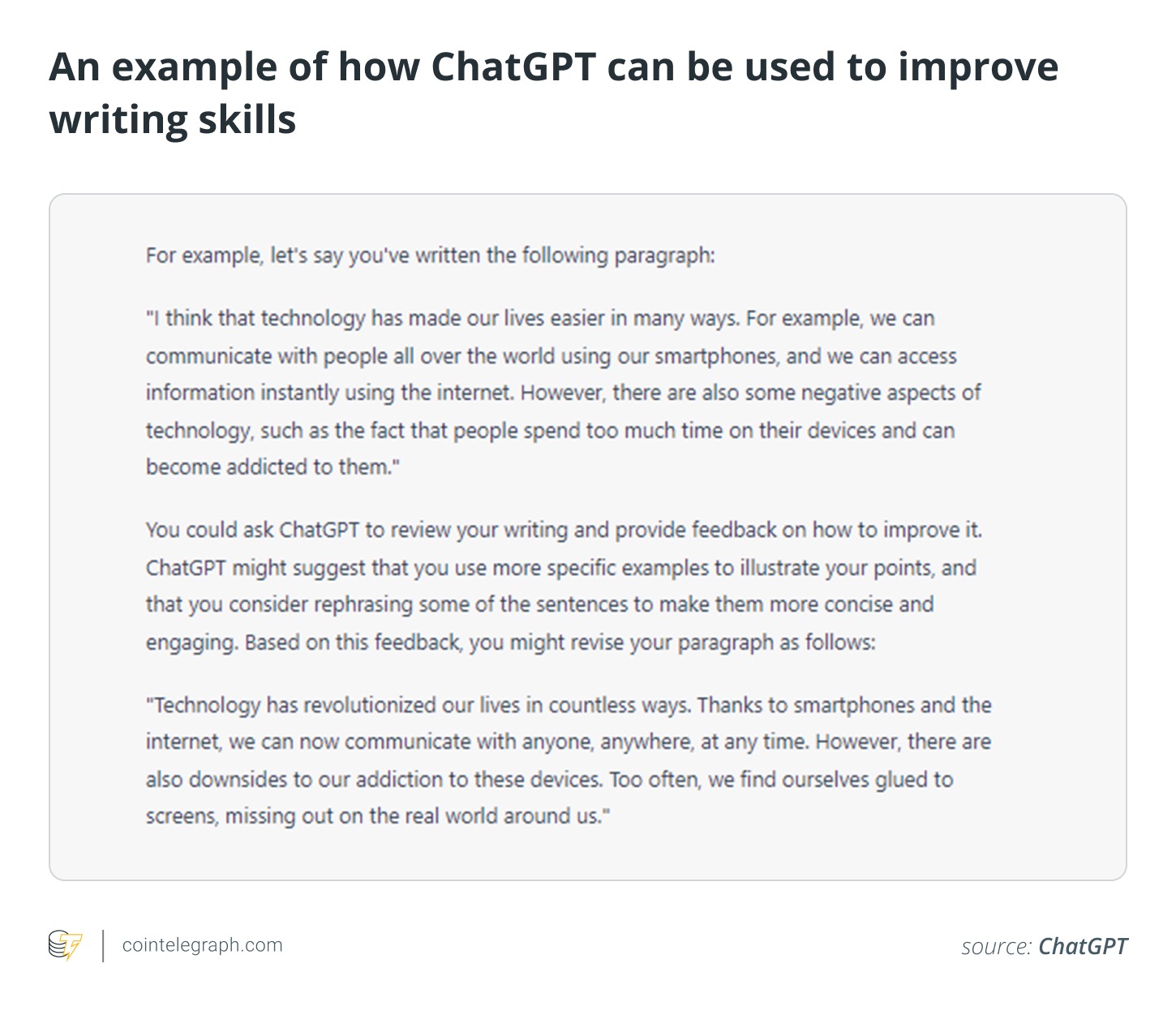 ChatGPT can be utilized to enhance writing abilities in a foreign language. Learners can obtain comments and corrections to help them with their grammar, syntax and sentence structure by practicing writing activities and submitting them to ChatGPT. This can be a useful method for determining which areas require more practice and for developing writing confidence in a foreign language.