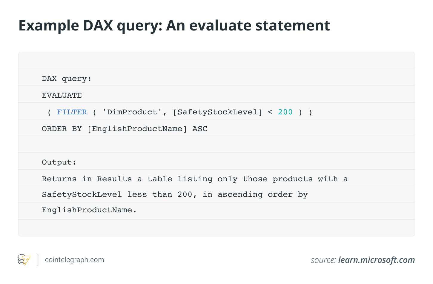 A DAX query resembles a statement, similar to a SELECT statement in T-SQL. The simplest form of a DAX query is an “evaluate” statement, as shown in the example below: