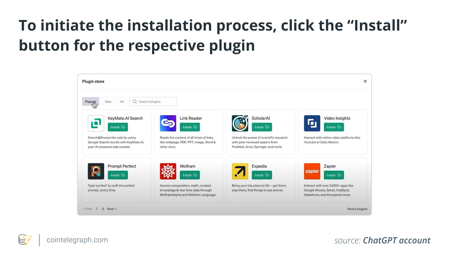 https://images.cointelegraph.com/cdn-cgi/image/format=auto,onerror=redirect,quality=90,width=840/https://s3.cointelegraph.com/uploads/2023-07/751b1339-473c-4a70-9879-c30e545cf4bf.jpgChatGPT currently supports third-party plugins with different functionalities that augment ChatGPT’s utility.