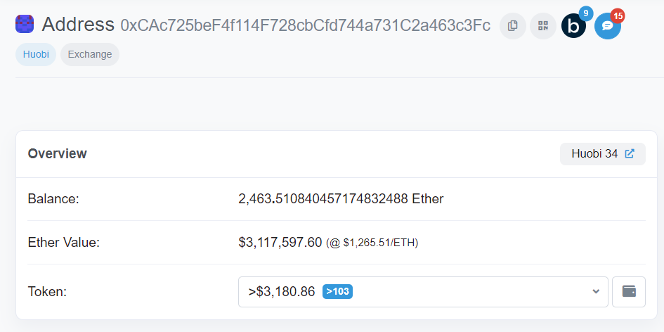 Blockchain investigator Colin Wu pointed out the transactions on Etherscan, which proves that Huobi had shown 14,858 ETH in its latest snapshot, which has since fallen down to 2,463.5 ETH at the time of writing.