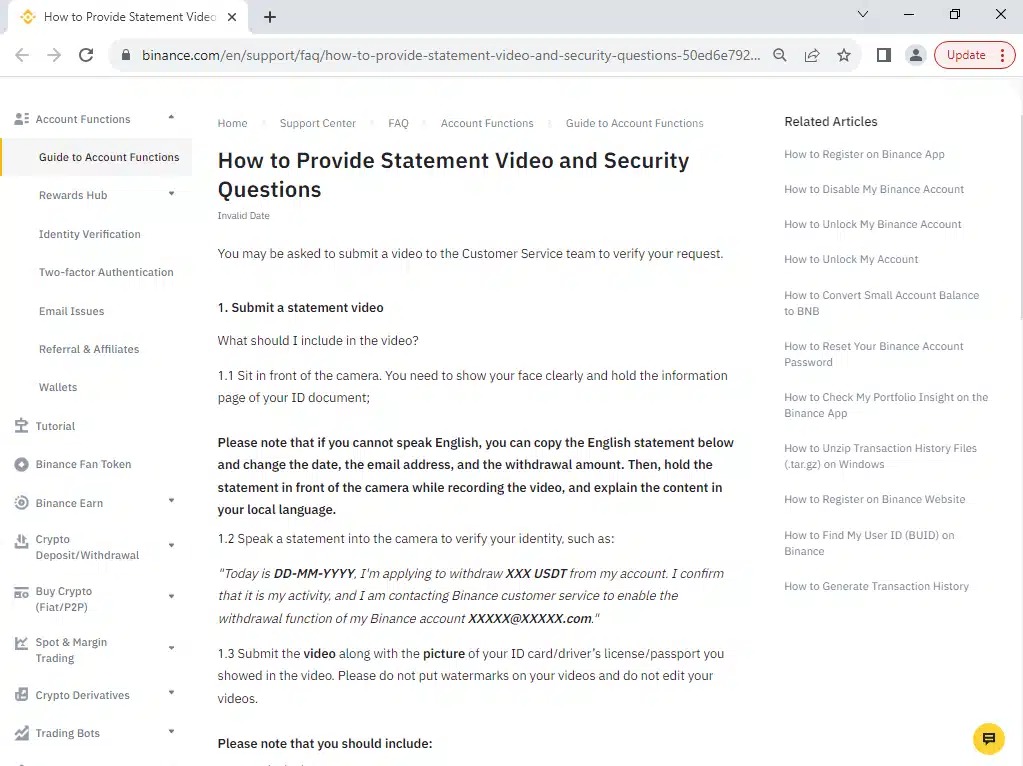 Binance’s statement video specifically requires users to submit the video along with the picture of their identity document, such an ID card, driver’s license or passport. The policy requires users to mention the date and certain requests on the video record.