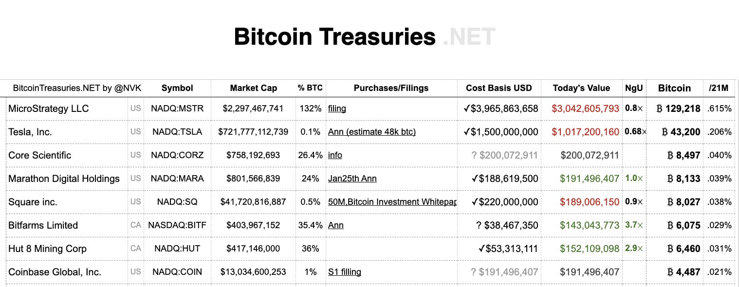 According to Bitcointreasuries.net, the 130,000 and 43,00 Bitcoin (BTC) held by Microstrategy and Tesla respectively are worth considerable sums less.