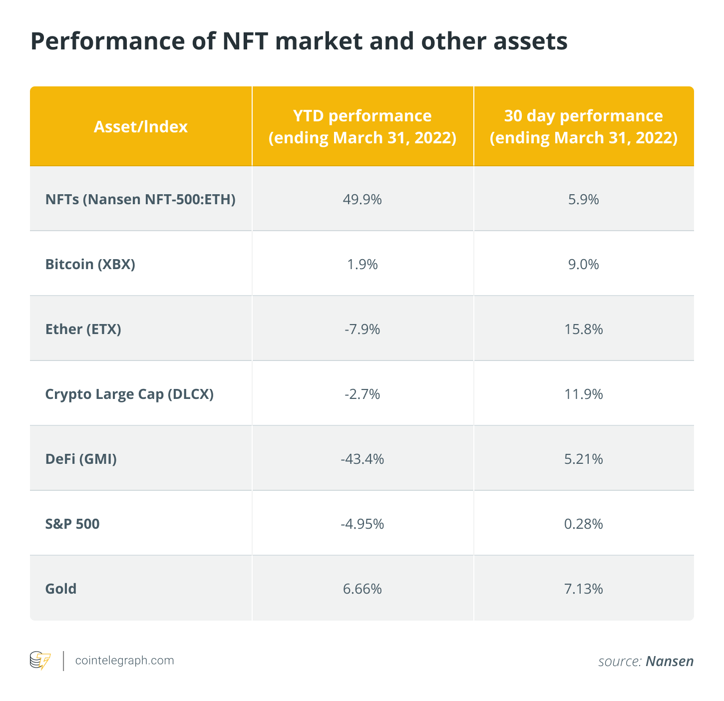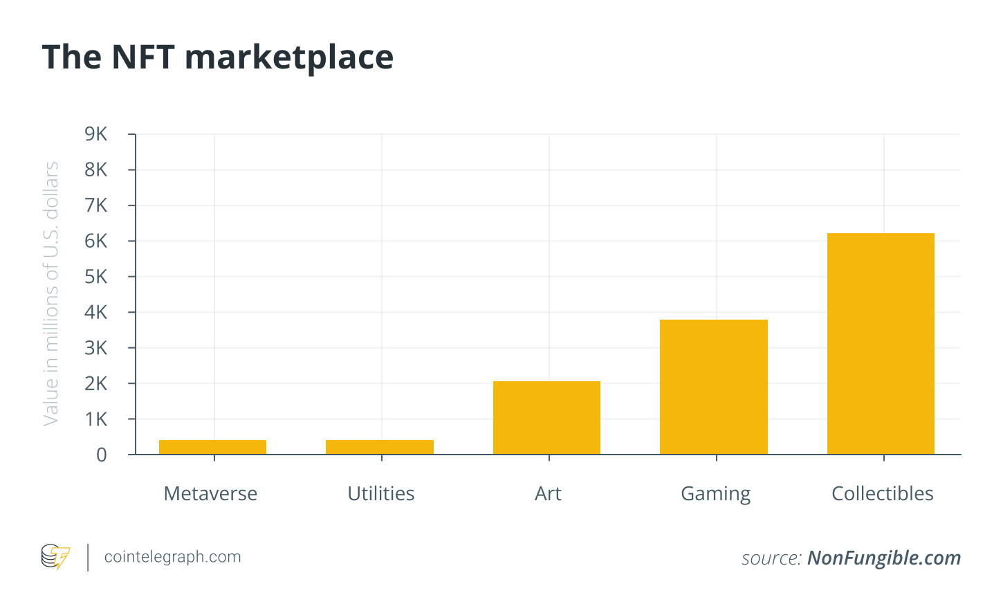 https://images.cointelegraph.com/images/840_aHR0cHM6Ly9zMy5jb2ludGVsZWdyYXBoLmNvbS91cGxvYWRzLzIwMjItMDQvOWFiZjQzZjUtNzdmNC00MDhkLTg0NzgtOTQ0ODRhZDY2OGYyLmpwZw==.jpgMetaverses and blue-chip nonfungible tokens (NFTs) are the driving forces behind the dramatic growth in the NFT market. Projects like the Bored Apes, Crypto Punks, Azuki, Clone X and Doodles collections have steadily attracted collectors’ interest in the past year. As a result, these NFT projects have helped the NFT market achieve a growth rate of over 20,000% and a sales volume of approximately $17 billion.