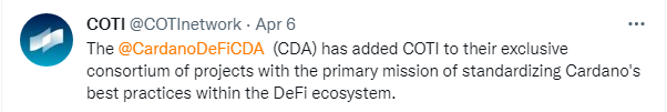Some of the Cardano-based protocols that COTI has established working relationships with include the Cardano DeFi Alliance, Adaswap, Project Catalyst and NFT-Maker.