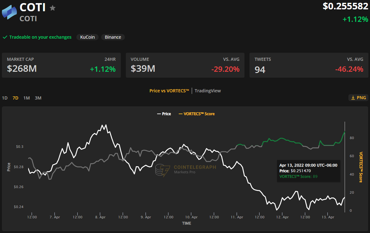 VORTECS™ charts from Cointelegraph Markets Pro show that COTI, an enterprise-grade financial technology platform focused on decentralized payments and digitization for any form of currency, could be on the verge of a breakout.