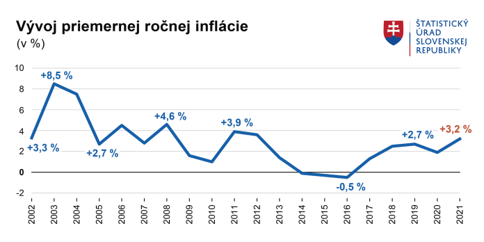 Počas posledných 10 rokov sa inflácia na Slovensku držala na úrovni okolo 0 až 4 %. Iba počas prvého mesiaca tohto roka ceny narástli o takmer 3 %. Očakáva sa, že ročná inflácia v roku 2022 bude na hodnote okolo 10 %. Naposledy takéto vysoké hodnoty malo Slovensko pred 19 rokmi, keď priemerné ceny vzrástli medziročne o 8,5 %.