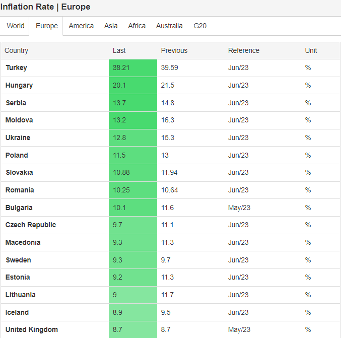 Od Slovenska majú v Európe vyššiu infláciu už len krajiny, ktoré nie sú členmi eurozóny. Ide o Turecko (38,21 %), Maďarsko (20,10 %), Srbsko (13,70 %), Moldavsko (13,20 %), Ukrajinu (12,80 %) a Poľsko (11,50 %). Hneď druhá krajina po Slovensku s najvyššou infláciou v eurozóne je Česko (9,70 %).
