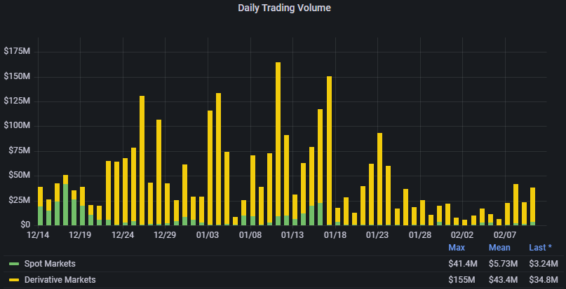 The addition of new assets helped lead to an increase in trading volume on the protocol over the past few days after hitting its lowest level in several months on Feb. 2.