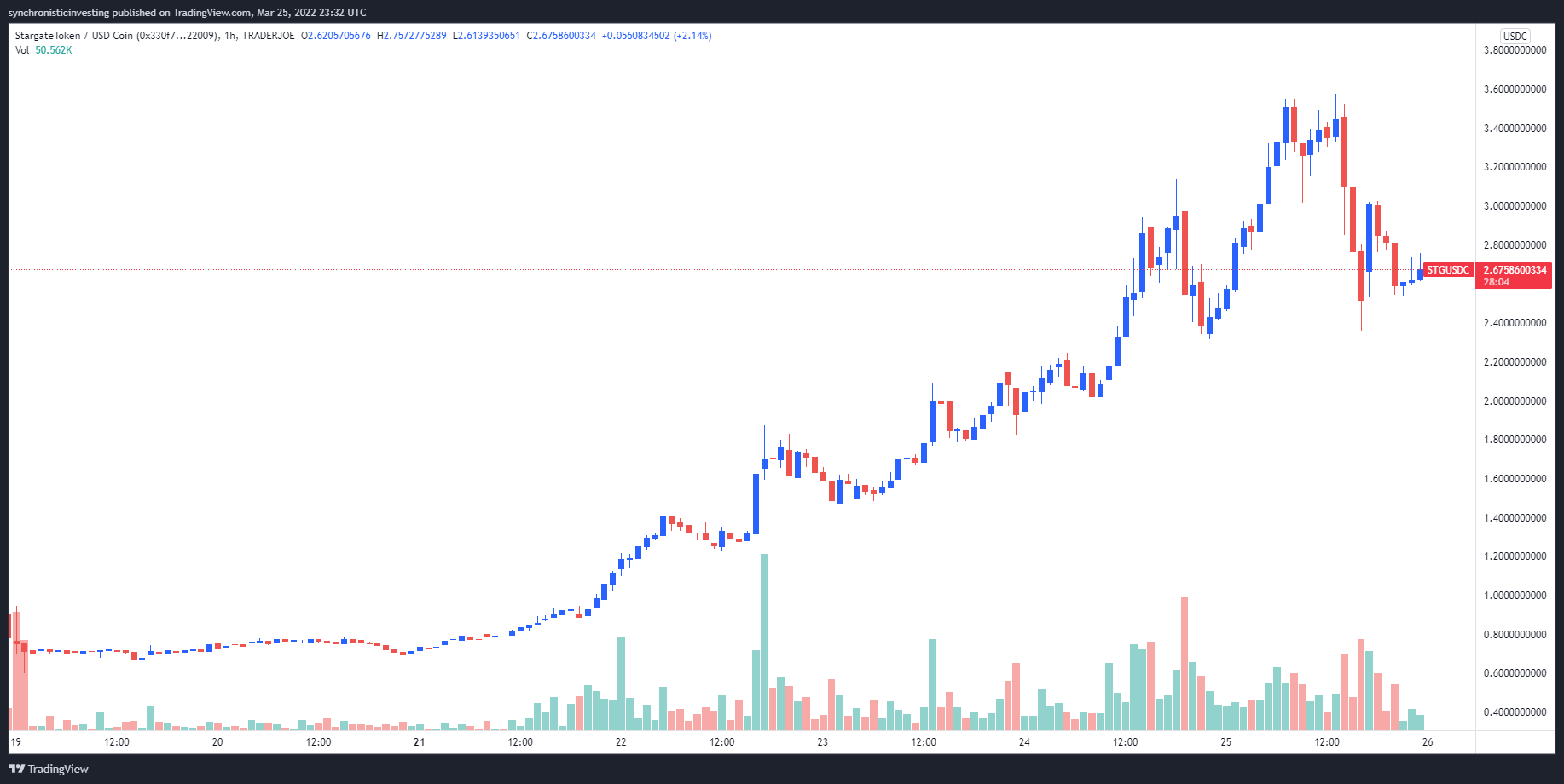 Data from Cointelegraph Markets Pro and TradingView shows STG was listed on exchanges on March 17 and its price has climbed 438% from a low of $0.665 to a high of $3.58 on March 25.