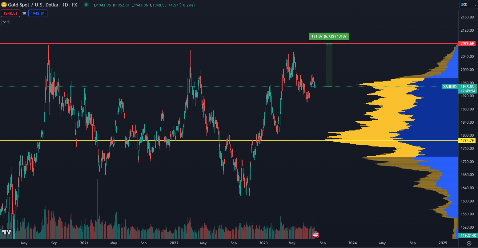 Zlato je v súčasnosti najdôveryhodnejším alternatívnym aktívom na svete. Podľa údajov Tradingview sa zlato obchoduje na trhovej cene 1 948 dolárov a nachádza sa iba 6,70 % od dosiahnutia historického maxima, ktoré sa sformovalo 3. mája 2023 na cene 2 080 dolárov.