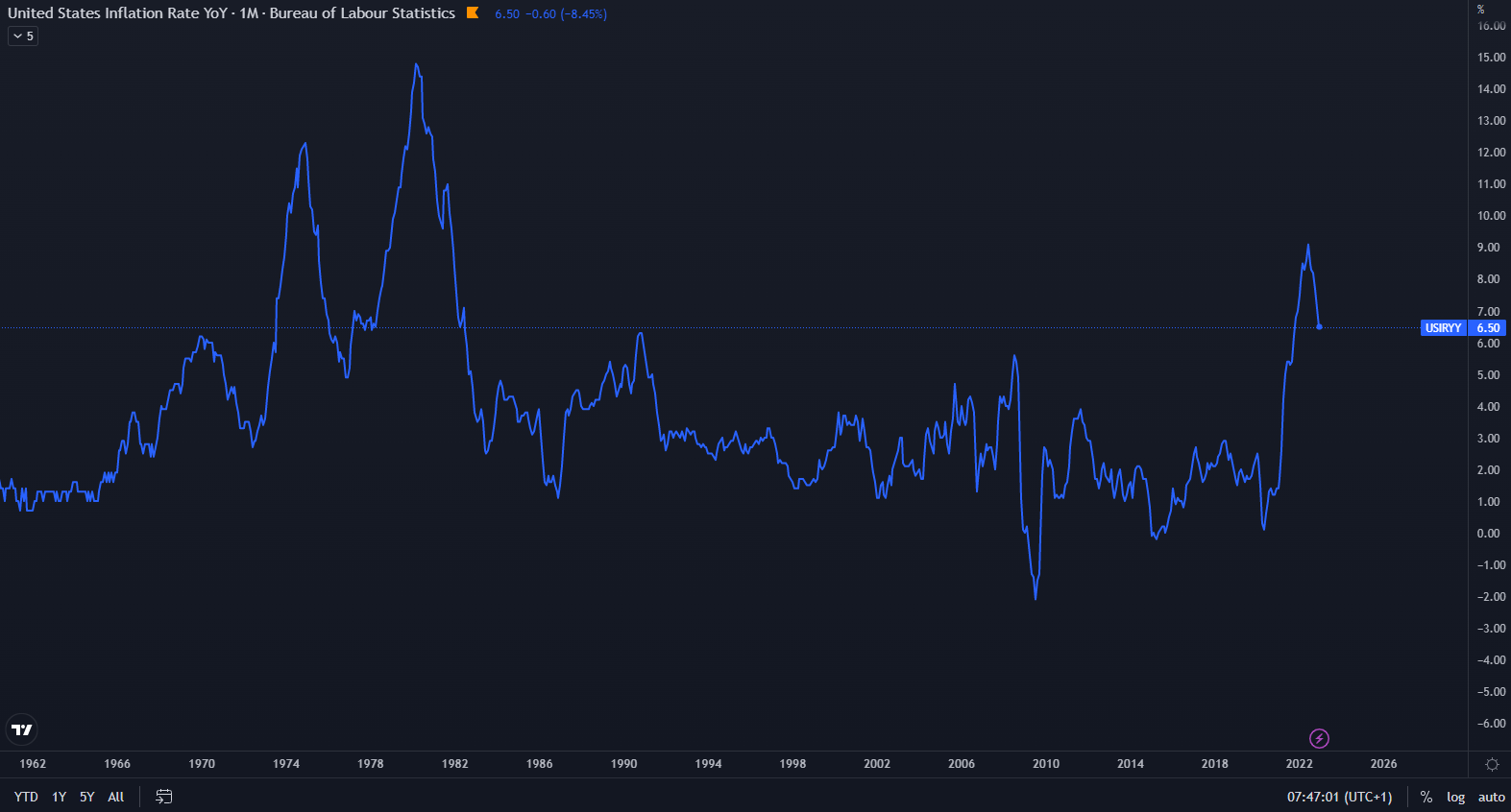 FED síce spomalil tempo zvyšovania úrokových sadzieb, no na ekonomický rast môžeme zatiaľ zabudnúť. Nedávno sme vás informovali o poslednom zvýšení úrokových sadzieb o 25 bázických bodov. V súčasnosti je podľa údajov TradingView inflácia v USA na úrovni 6,50 %, čo je v čase písania článku o 2 % menej v porovnaní s eurozónou. Ak sa zaujímate o to, prečo pokles inflácie v eurozóne zaostáva za USA, môžete si prečítať článok Inflácia v USA prudko klesla: prečo Európa zaostáva?