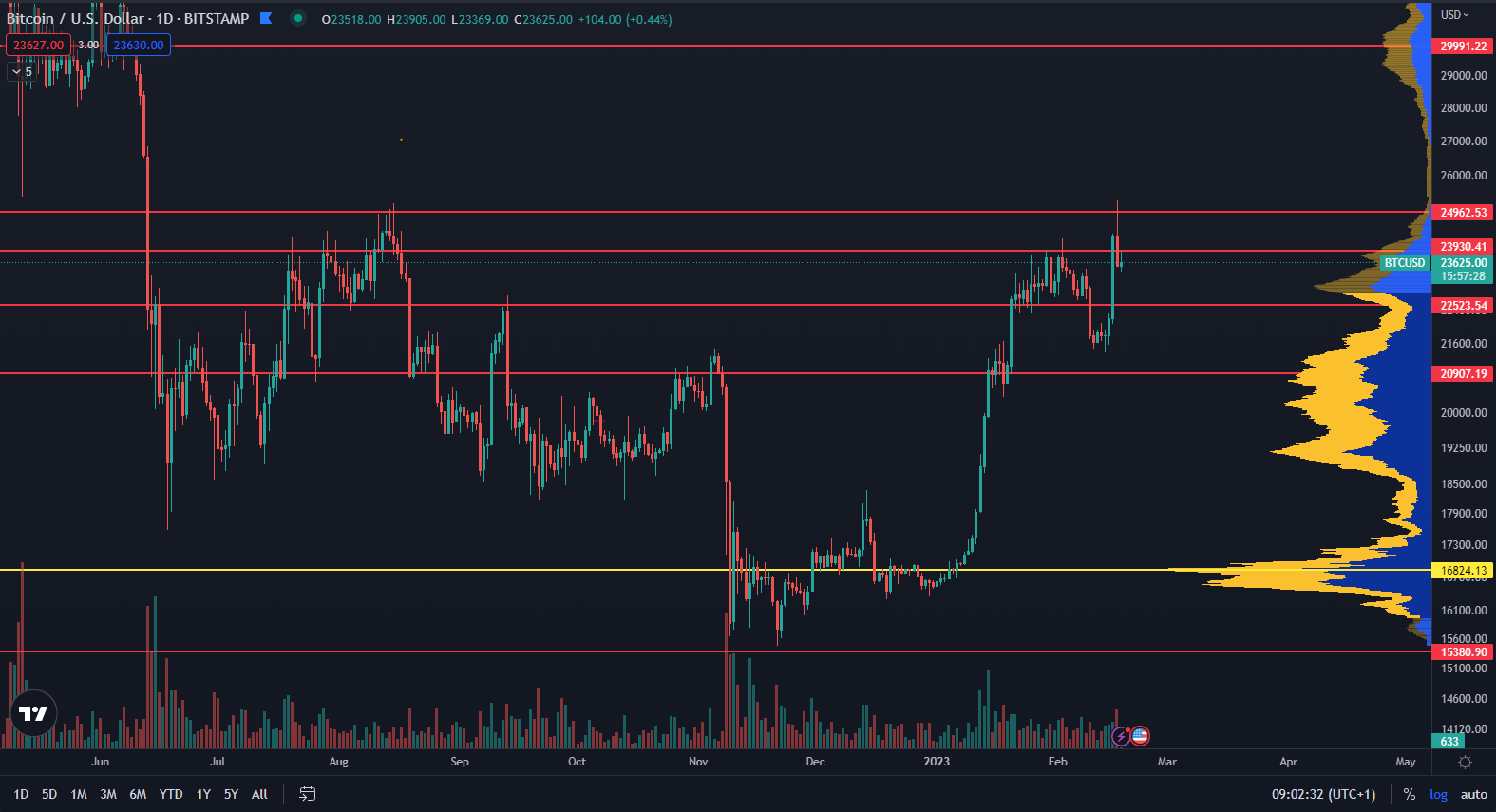 Rezistencia 25 000 dolárov bola rešpektovaná už v auguste 2022 a BTC momentálne sformoval dvojitý vrchol na tejto cenovej úrovni. Uzatváracia cena sviečky zo 16. februára ale nezaznamenala nižšie hodnotu ako otváracia cena z predošlého dňa. To znamená, že sviečkový pattern nie je reverzný.