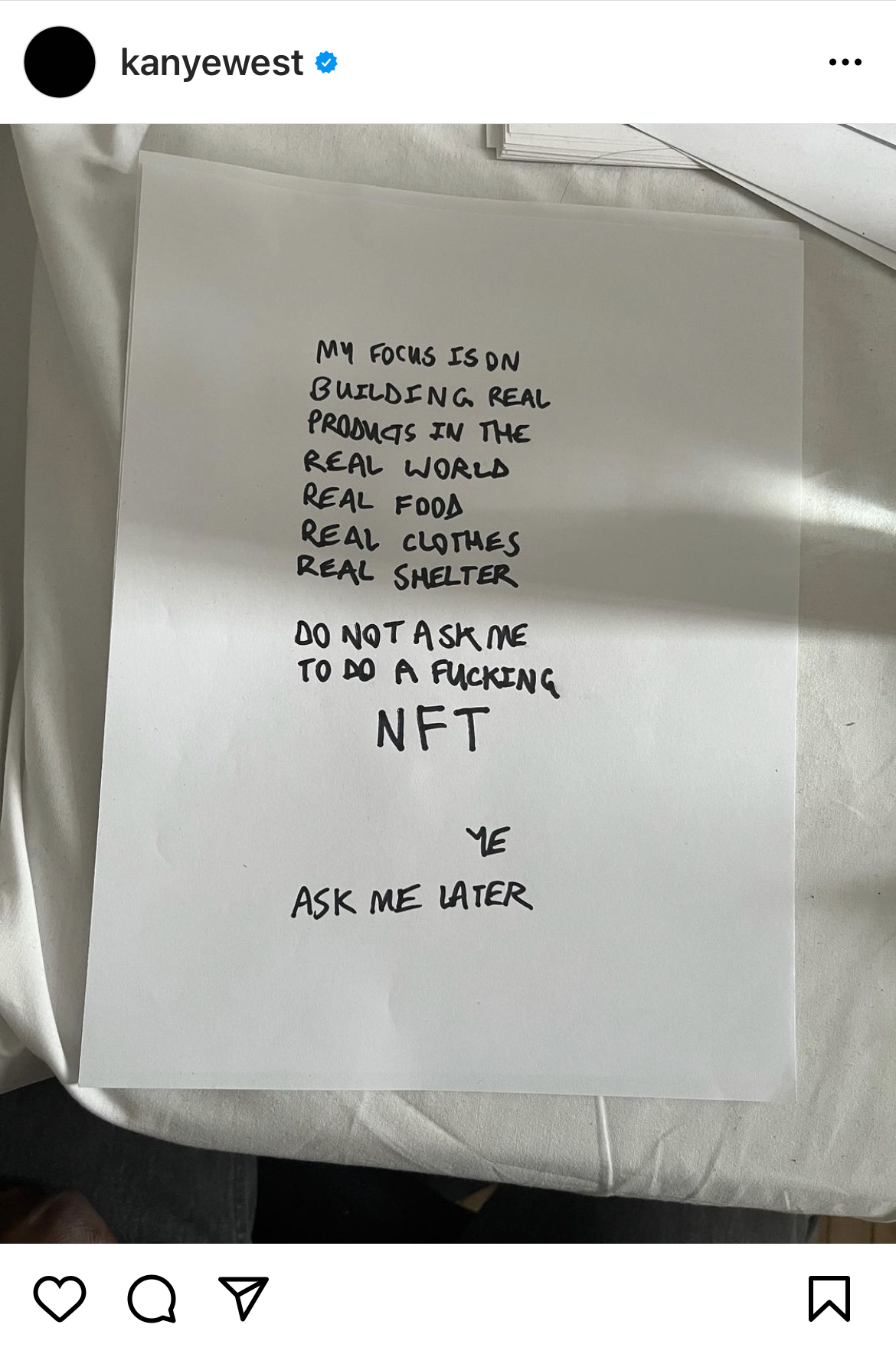 In a strongly worded Instagram post made on Monday, Ye stated “Do not ask me to do a f*cking NFT.” The message in the photo, shared with his 10.5 million followers, explains he is focused on “building real products in the real world.”
