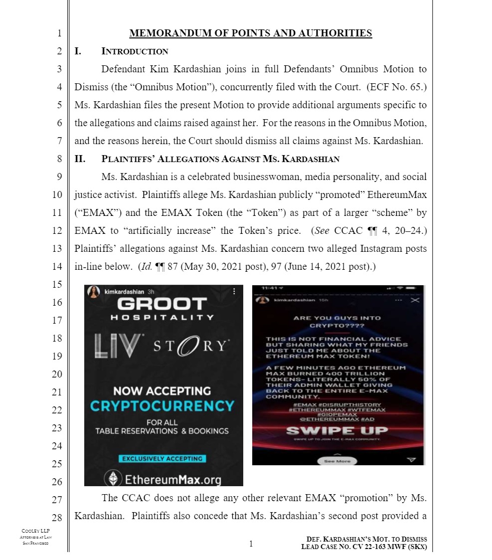Kardashian’s legal team has argued for the dismissal of the class action lawsuit in court documents reviewed by Cointelegraph, hitting back at the ten claims brought against the influencer. A key point was Kardashian’s Instagram stories in question: