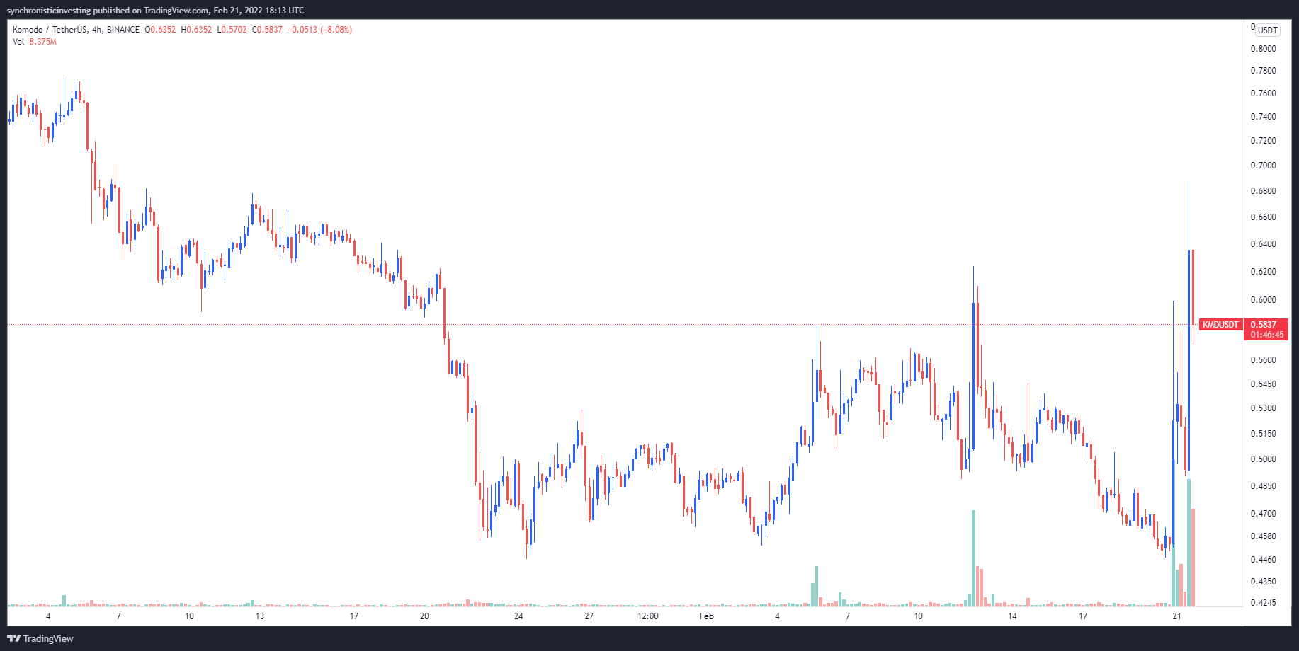 Data from Cointelegraph Markets Pro and TradingView shows that after hitting a low of $0.446 on Feb. 20, the price of the platform’s KMD token surged 54% to a daily high of $0.687 on Feb. 22.