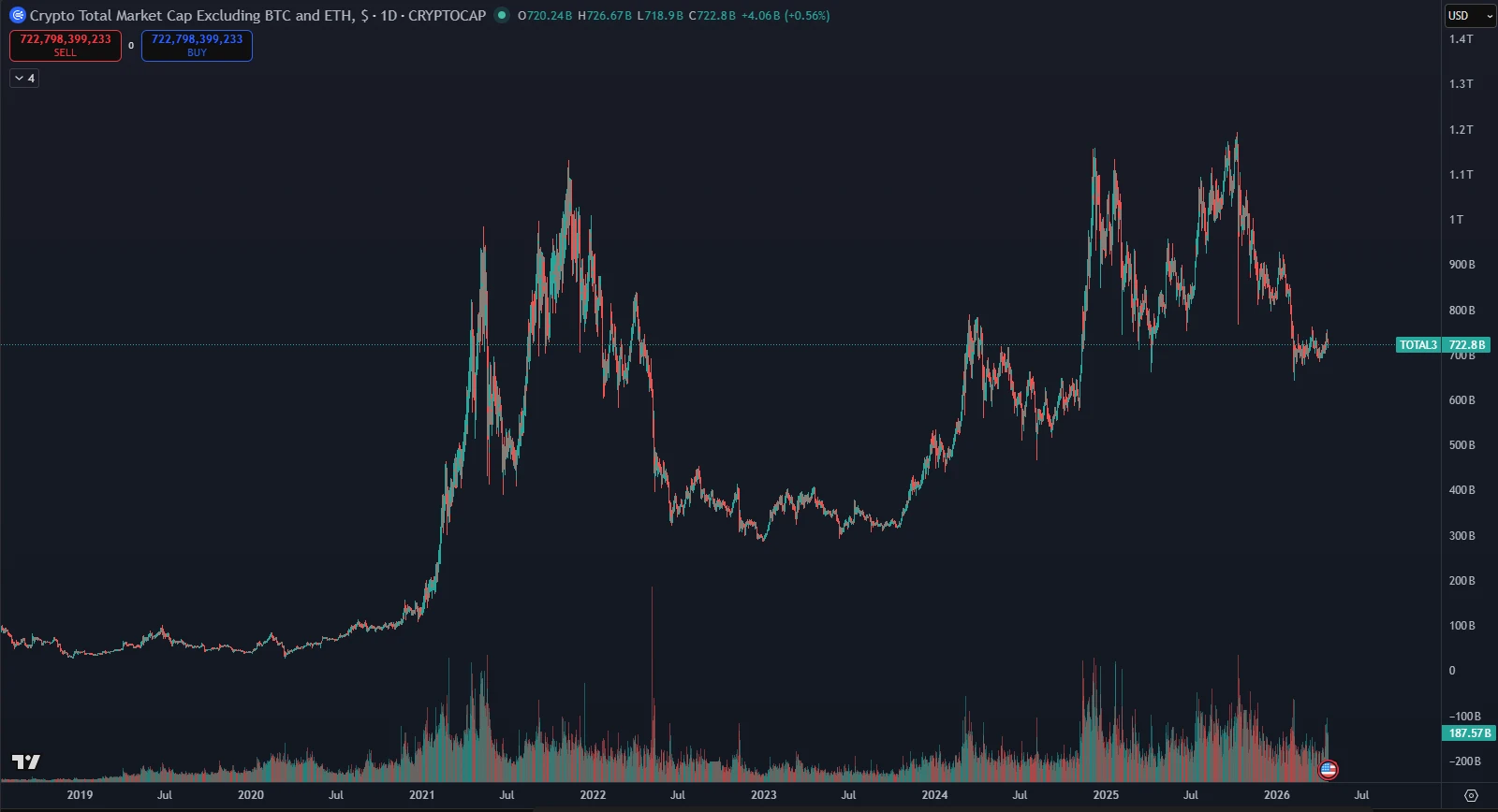 Od dosiahnutia vrcholu v októbri 2025 prešli Bitcoin aj altcoiny výraznou korekciou. Ukazovateľ Total 3, ktorý reprezentuje trhovú kapitalizáciu sektora altcoinov bez započítania Bitcoinu, Etherea a stablecoinov, stratil počas tohto obdobia takmer 460 miliárd dolárov. Tento prepad predstavuje približne 38 % jeho celkovej hodnoty. Napriek tomu však Total 3 od februára získal späť približne 90 miliárd dolárov. Deje sa tak napriek napätej geopolitickej situácii a makroekonomickému prostrediu, ktoré naďalej obmedzuje dostupnú likviditu na trhoch.