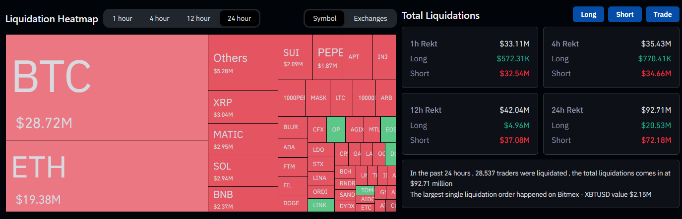 Za posledných 24 hodín bolo podľa Coinglass zlikvidovaných 28 537 obchodníkov, zatiaľ čo objem celkovej likvidácie predstavuje 92,71 milióna dolárov. Najväčší jednotlivý príkaz na likvidáciu sa stal na burze Bitmex pri páre XBT/USD v hodnote 2,15 milióna dolárov.