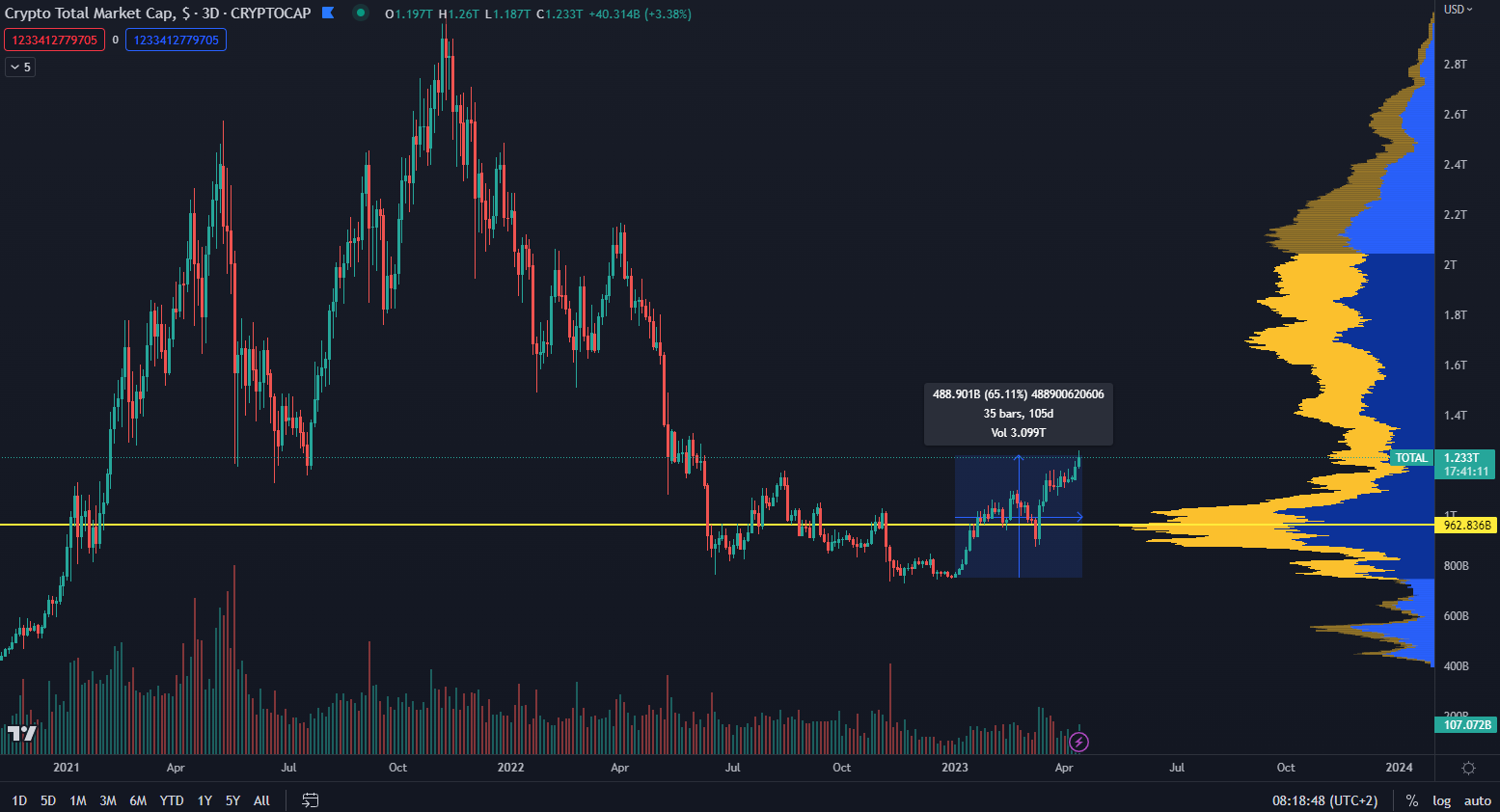 Po januárovom a marcovom raste nasleduje aj aprílový, ktorý potvrdzuje silu na strane nakupujúcich. Trhová kapitalizácia kryptomien v priebehu roka 2023 rastie takmer celú dobu, pričom digitálne meny nezaznamenali takýto trend od posledného bullrunu. Podľa údajov TradingView existuje dokonca priestor na to, aby kryptomeny pokračovali v raste.