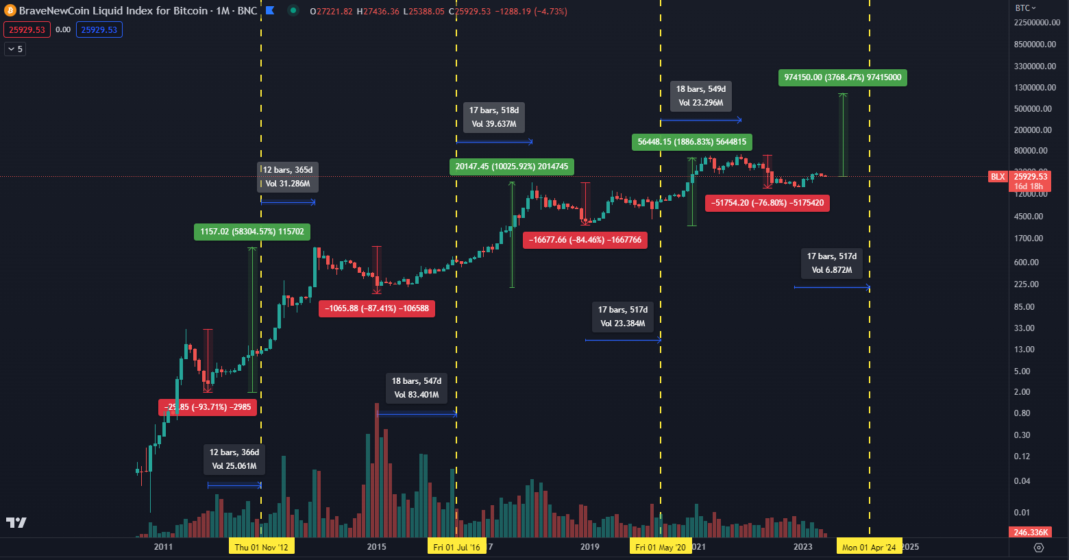 Ak sa pozrieme na časové rámce bitcoinového indexu BLX v logatirmickom (percentuálnom) vyjadrení zistíme, že bitcoin sa nachádza v počiatočnej fáze rastúceho trendu. V predošlom cykle bolo medzi dnom korekcie a halvingom približne 517 dní. Dno poslednej korekcie sa sformovalo v novembri 2022 a existuje presne rovnaký časový interval do halvingu, ktorý nastane v apríli 2024.