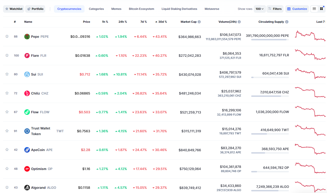 Medzi najviac zasiahnuté kryptomeny patria napríklad Pepe, Flare a Sui. Všetky stratili za posledný mesiac približne 40 % svojej hodnoty.