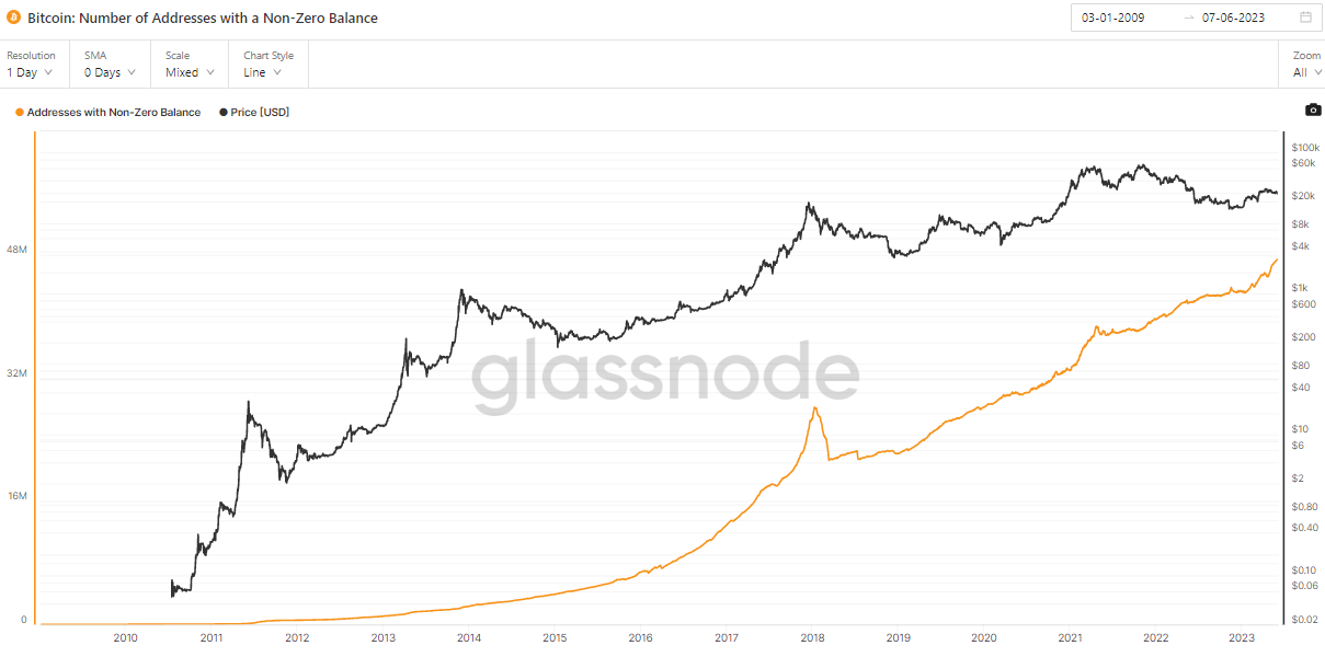 Okrem aktivity v sieti dosiahol nový rekord podľa údajov Glassnode aj počet adries s nenulovým zostatkom na bitcoinovej sieti. Týka sa to predovšetkým adries, ktoré vlastnia maximálne 1 BTC. Počet tých, ktoré vlastnia viac ako 1 BTC už niekoľko rokov stagnuje a počet tých najbohatších peňaženiek dokonca klesal.
