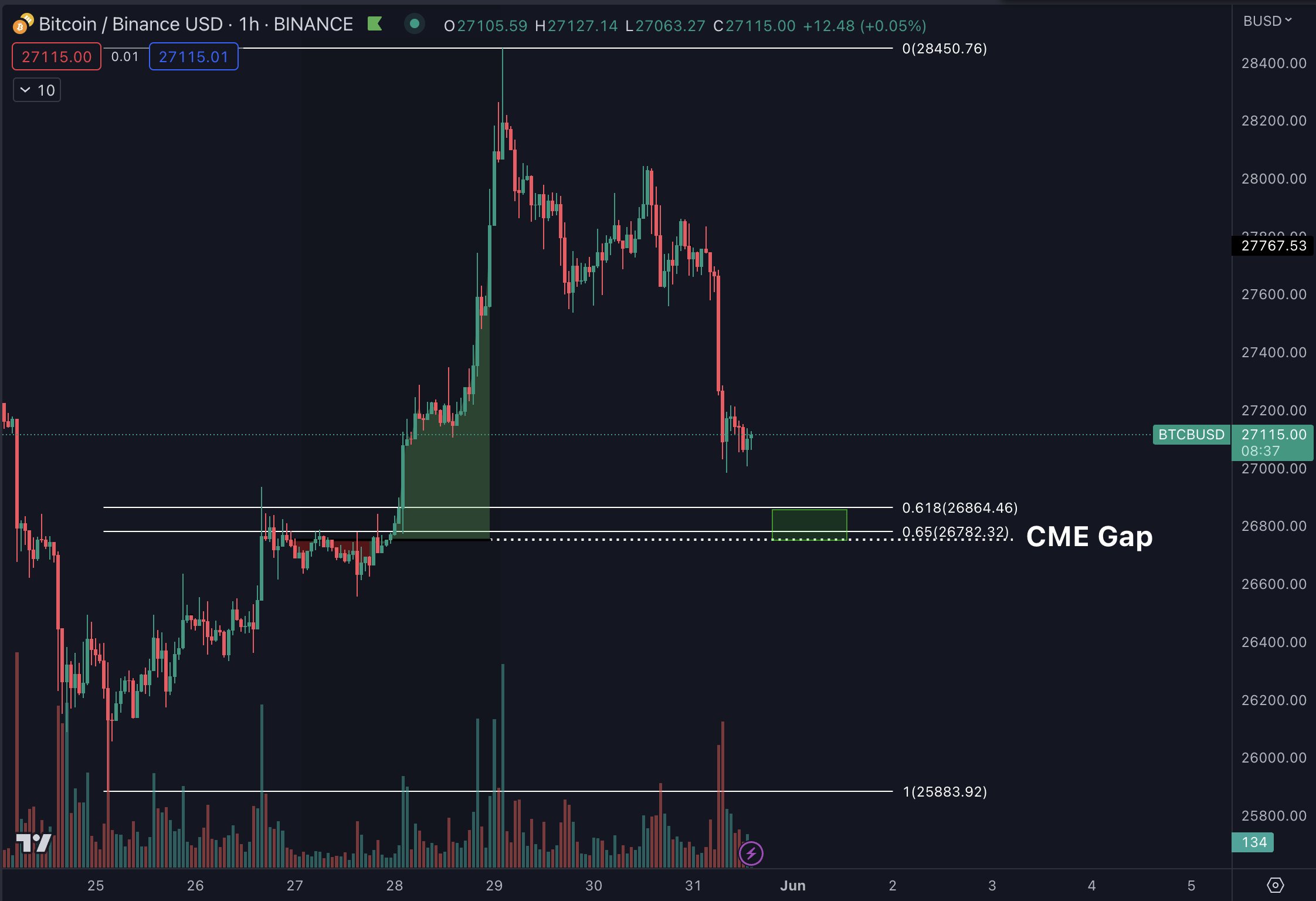 “Confluence at the $26750 region with the CME gap as well as the Golden Pocket on the Fibonacci retracement. Will see how price reacts when/if it gets there,” he commented alongside a 1-hour chart.