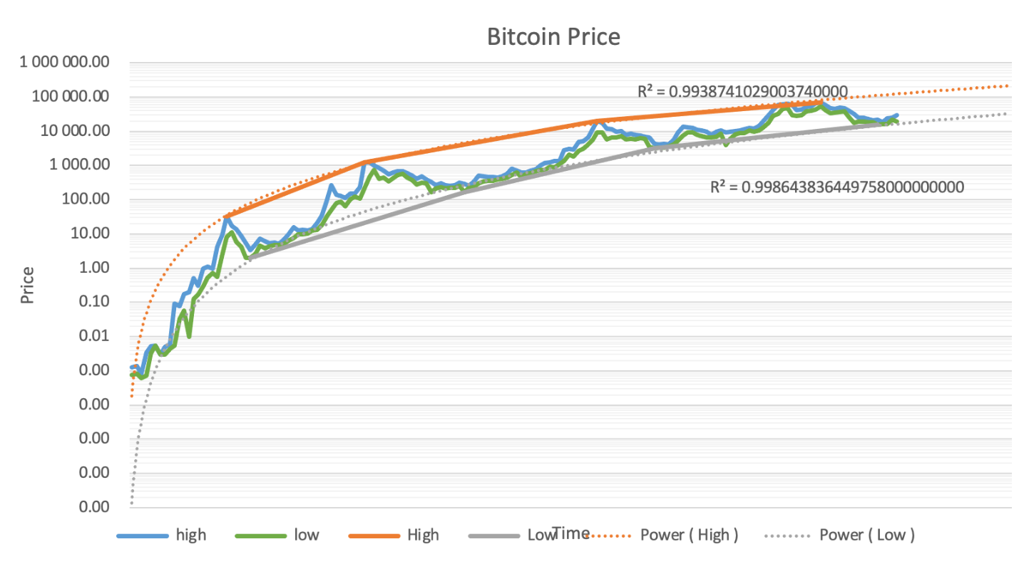 “By combining expected halving dates and days to cycle tops and cycle bottoms alongside extrapolated regression of price data, it is possible to use this model in predicting where Bitcoin price may reside at the peak and trough of future cycles,” he continued.