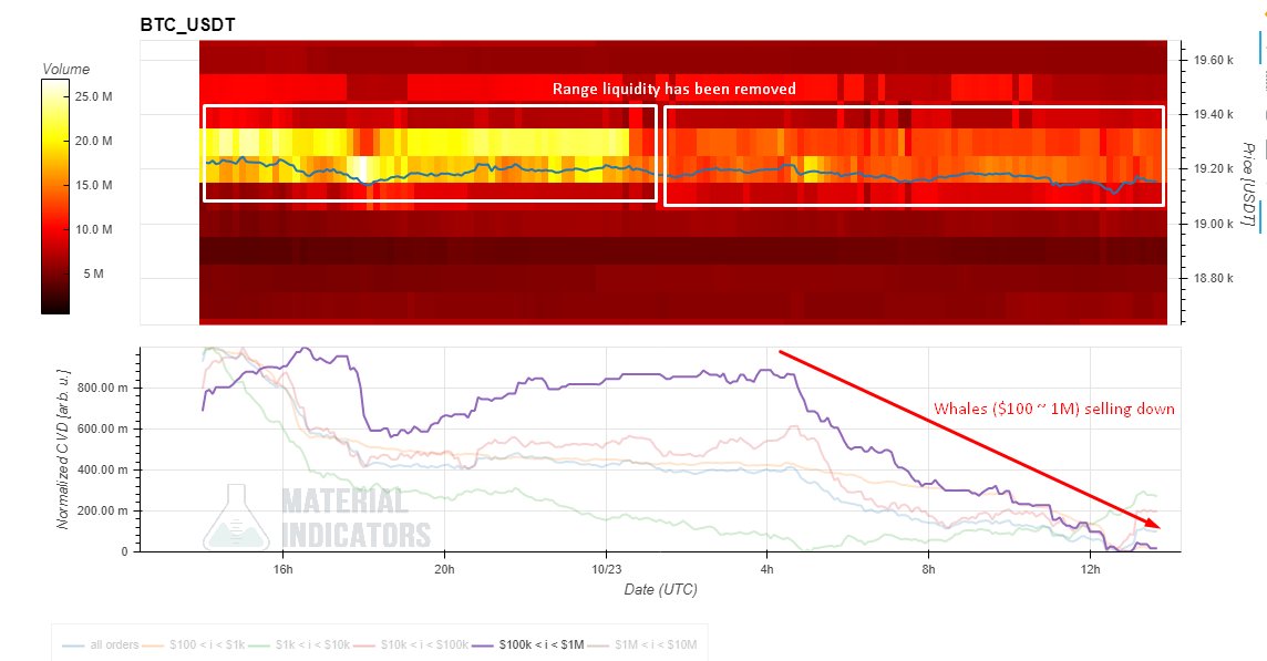 “Liquidity from the range has been removed, or at least significantly reduced,” he summarized, adding that “Whales ($100k ~ $1M) are selling down.”