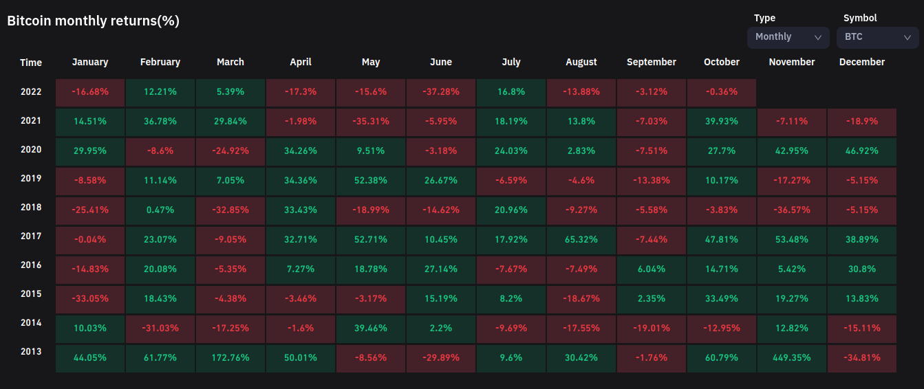 Data from data resource Coinglass shows that October 2022 is the flattest October on record percentage-wise, and a shadow of last year, which delivered 40% gains.