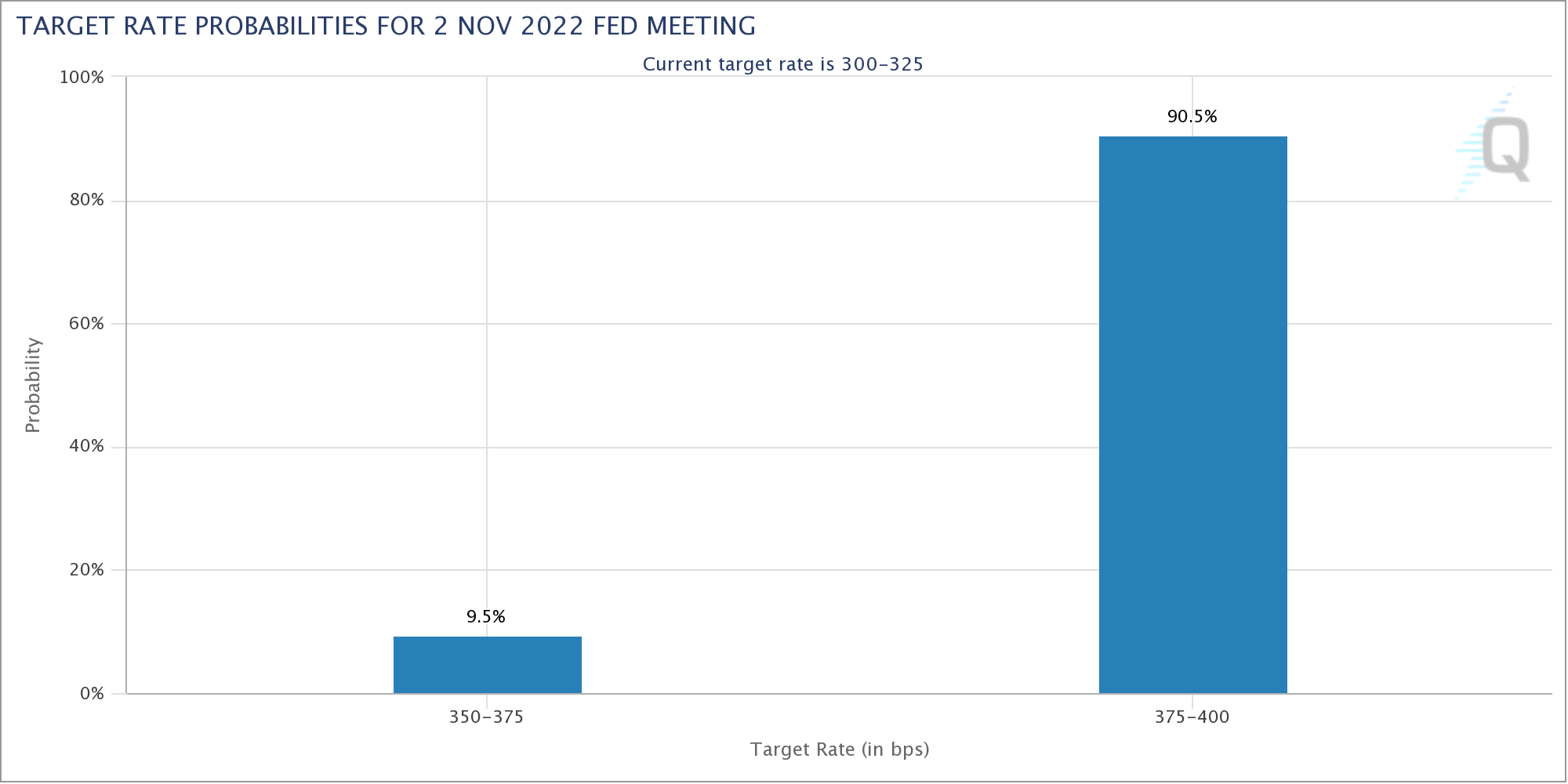 CME Group’s FedWatch Tool had the chance of 75 basis points in November at 90.5% at the time of writing.