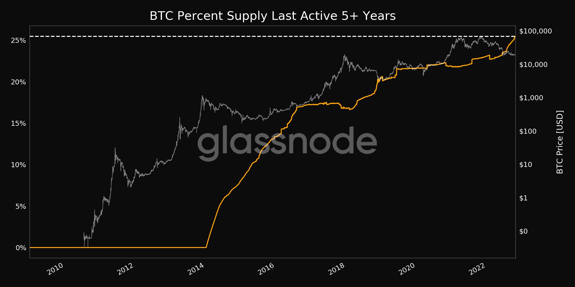 The supply issue is becoming more prescient — Glassnode also confirms that the amount of the BTC supply now dormant for at least five years is now higher than ever at 25.47%.