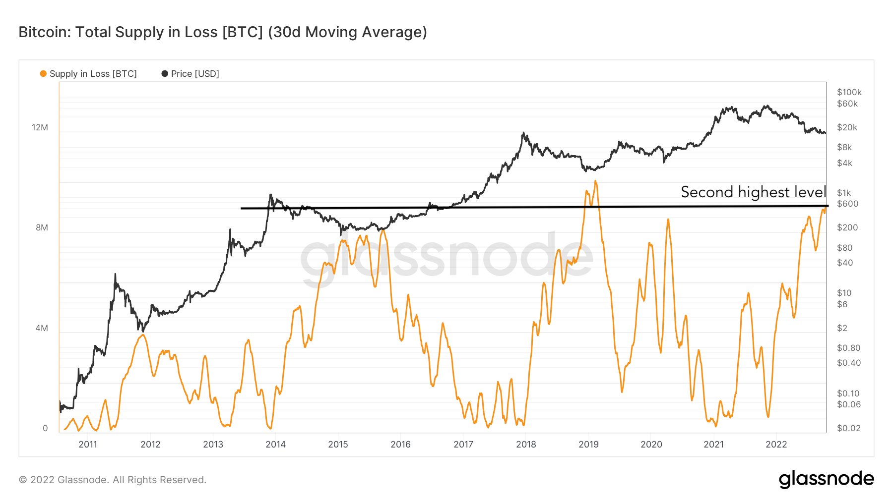 “BTC total supply in loss 30-day moving average is now at its second highest level ever.”