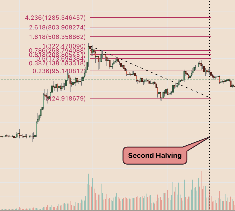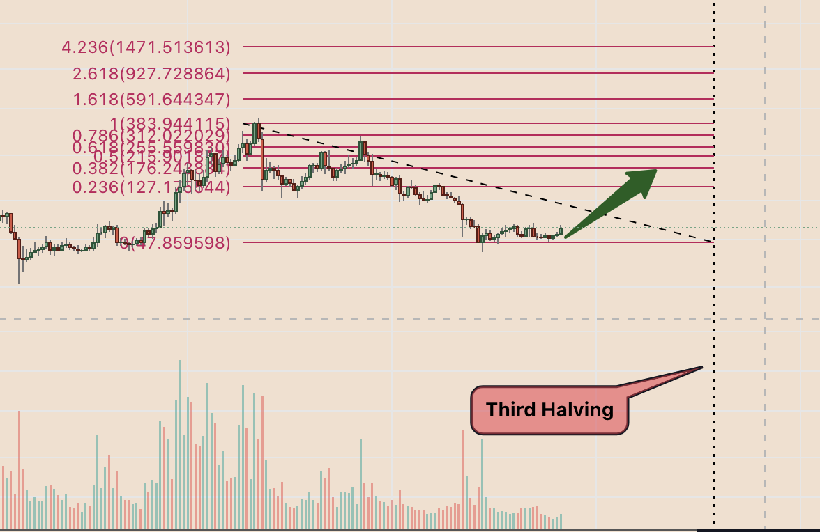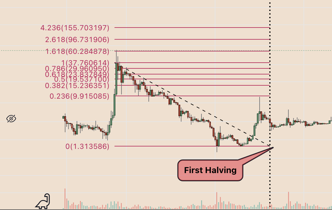 Drawing Fibonacci retracement graphs between Litecoin’s pre-halving correction peaks and bottoms highlights the likelihood of testing the 0.236 and 0.382 Fib lines as their upside targets.