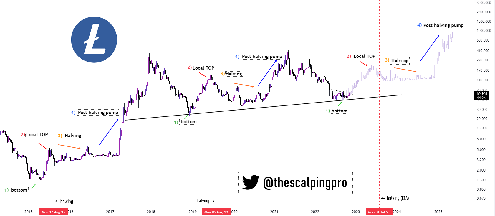 Litecoin’s third halving is scheduled to occur sometime in July 2023. Meanwhile, market analysts are already pointing out that LTC’s price is undergoing the same pre-halving trajectory as before the 2011 and 2019 events, now in the bottoming-out stage.
